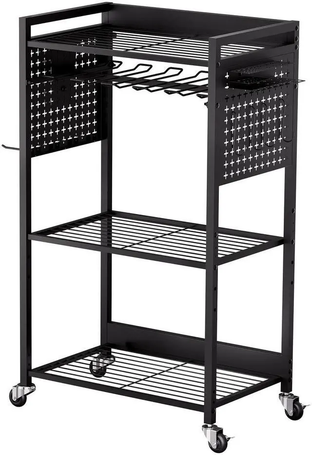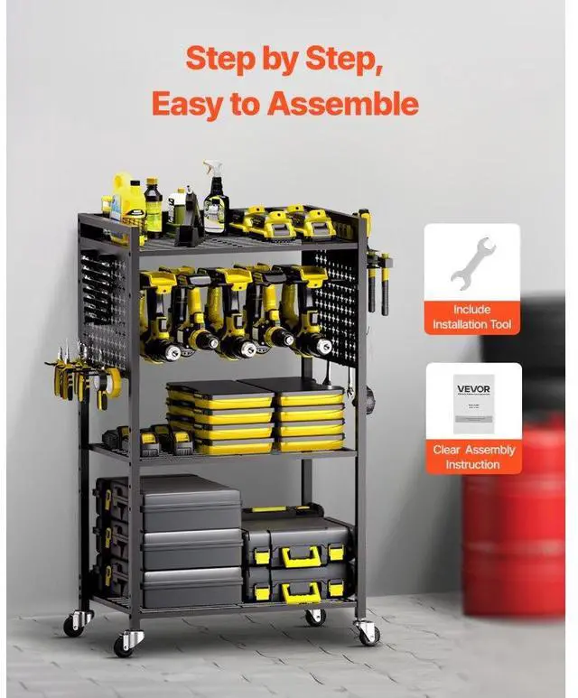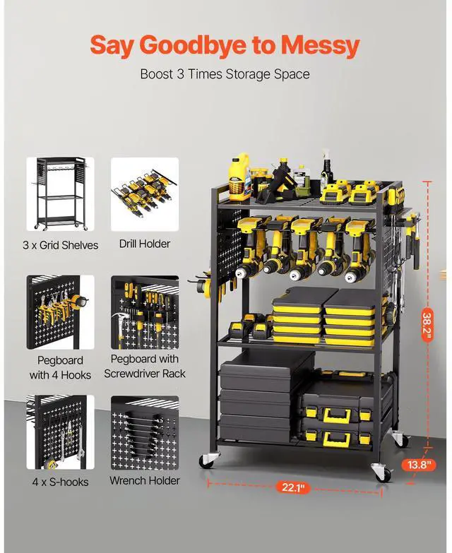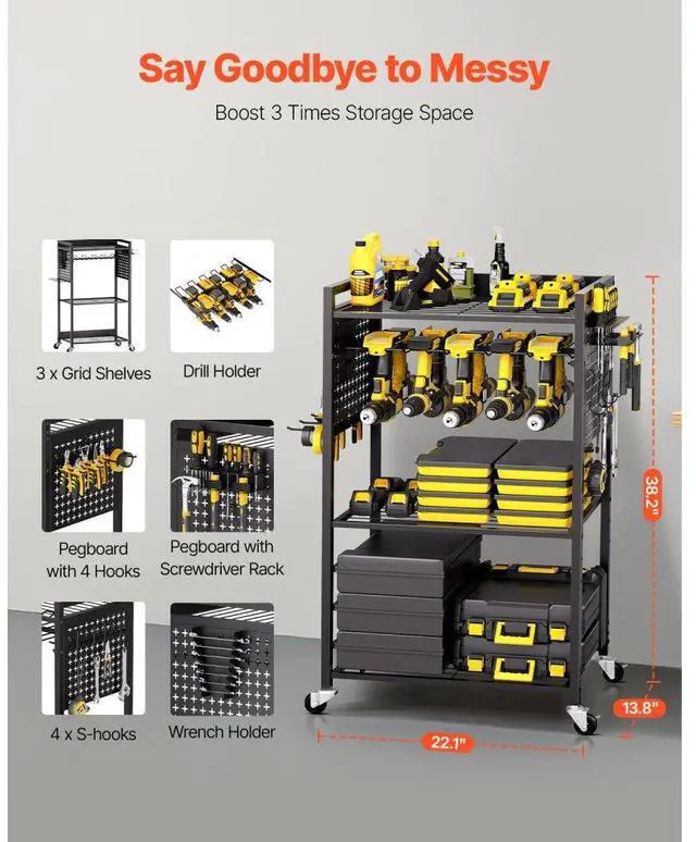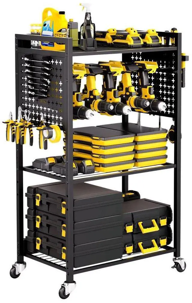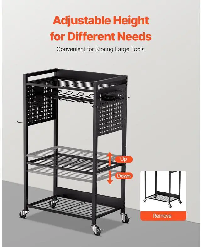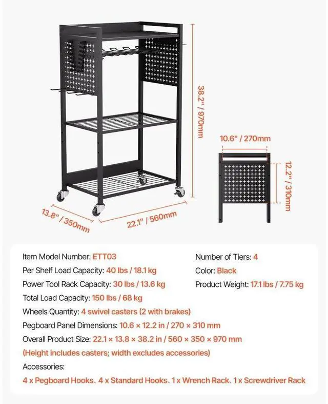 Power Tool Rack Capacity: 30 lbs / 13.6 kg,Number of Tiers: 4,Color: Black,Overall Product Size: 22.1 x 13.8 x 38.2 in / 560 x 350 x 970 mm (Height includes casters; width excludes accessories),Item Model Number: ETT03,Product Weight: 17.1 lbs / 7.75 kg,Total Load Capacity: 150 lbs / 68 kg,Per Shelf Load Capacity: 40 lbs / 18.1 kg,Wheels Quantity: 4 swivel casters (2 with brakes),Pegboard Panel Dimensions: 10.6 x 12.2 in / 270 x 310 mm