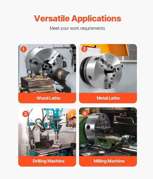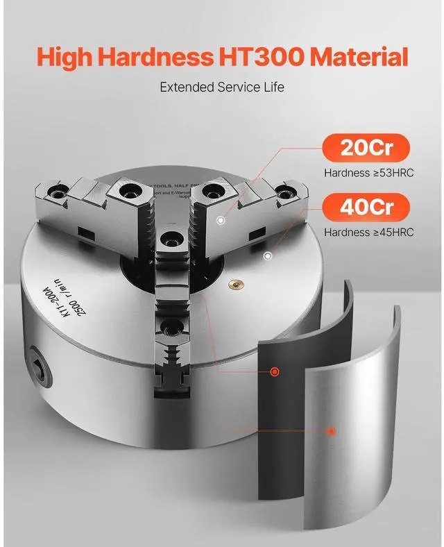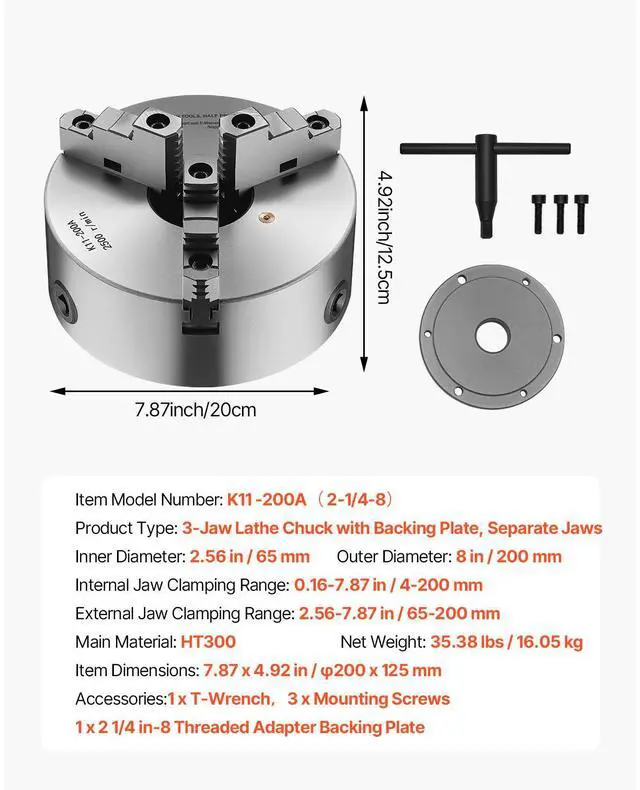 Outer Diameter: 8 in / 200 mm,Product Type: 3-Jaw Lathe Chuck with Backing Plate, Separate Jaws,Inner Diameter: 2.56 in / 65 mm,Item Model Number: K11 200A 2-1/4-8 ,Item Dimensions: 7.87 x 4.92 in / 200 x 125 mm,Internal Jaw Clamping Range: 0.16-7.87 in / 4-200 mm,External Jaw Clamping Range: 2.56-7.87 in / 65-200 mm,Net Weight: 35.38 lbs / 16.05 kg,Main Material: HT300
