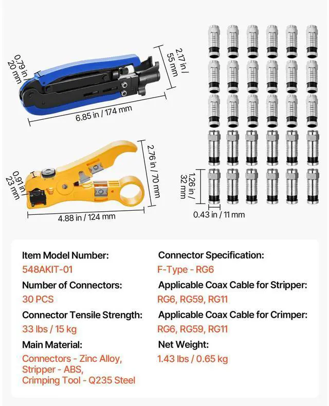 Crimper Dimensions: 6.85 x 2.17 x 0.79 in / 174 x 55 x 20 mm,Connector Dimensions: 0.43 x 0.43 x 1.26 in / 11 x 11 x 32 mm,Applicable Coax Cable for Crimper: RG6, RG59, RG11,Applicable Coax Cable for Stripper: RG6, RG59, RG11,Stripper Dimensions: 4.88 x 2.76 x 0.91 in / 124 x 70 x 23 mm,Item Model Number: 548AKIT-01,Number of Connectors: 30 PCS,Connector Tensile Strength: 33 lbs / 15 kg,Connector Specification: F-Type - RG6,Net Weight: 1.43 lbs / 0.65 kg