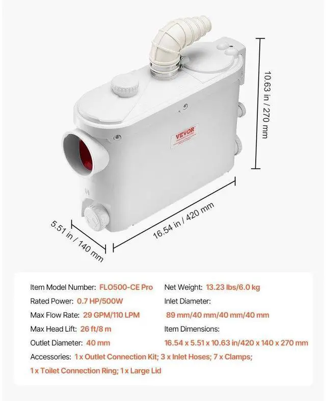 Max Head Lift: 26 ft/8 m,Inlet Diameter: 89 mm/40 mm/40 mm/40 mm,Outlet Diameter: 40 mm,Item Model Number: FLO500-CE Pro,Rated Power: 0.7 HP/500W,Item Dimensions: 16.54 x 5.51 x 10.63 in/420 x 140 x 270 mm,Max Flow Rate: 29 GPM/110 LPM,Net Weight: 13.23 lbs/6.0 kg