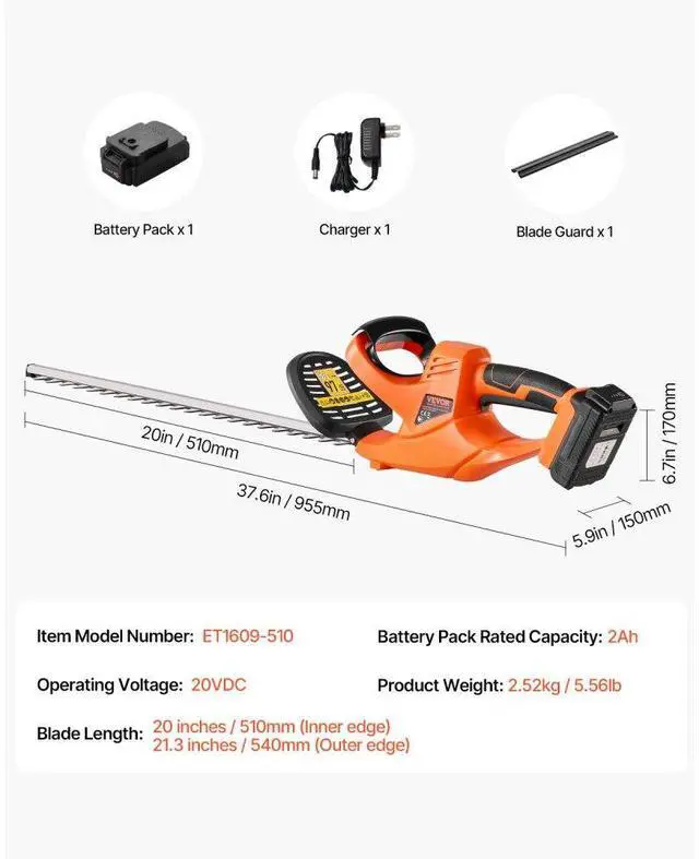 Product Type: Cordless Electric Hedge Trimmer for Low Branches,21.25 inches (540mm from the outer edge):,Operating Voltage: 20V DC,Blade Length:,Battery Pack Rated Capacity: 2Ah,Item Model Number: M0E-17ET-510,20 inches (510mm from the inner edge):,Product Weight: 2.52kg / 5.56lb,Style: Dual-Sided Cutting Teeth,Charger: Compatible with 110-120VAC, 60Hz, US plug, slow charge (1 charger included),Product Dimensions: 955 x 150 x 170mm / 37.6in x 5.9in x 6.7in,Battery Quantity: 1