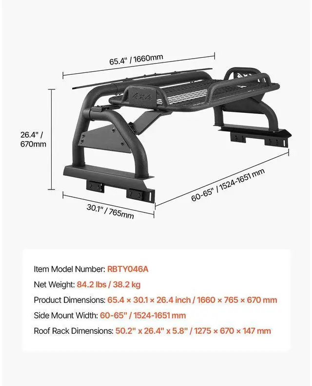 Side Mount Width: 60-65 inch / 1524-1651 mm,Luggage Rack Dimensions: 50.2 x 26.4 x 5.8 inch / 1275 x 670 x 147 mm,Item Model Number: RBTY046A,Item Dimensions: 65.4 x 30.1 x 26.4 inch / 1660 x 765 x 670 mm,Luggage Rack Weight Capacity: 150 lbs / 68 kg,Net Weight: 84.2 lbs / 38.2 kg,Main Material: Carbon Steel