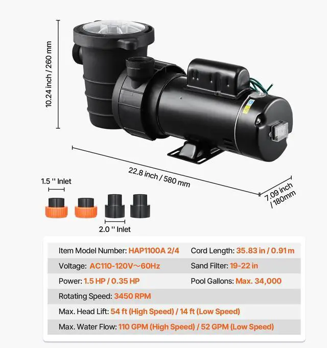 Rotating Speed: 3450 RPM,Max. Head Lift: 54 ft (High Speed) / 14 ft (Low Speed) ,Cord Length: 35.83 in / 0.91 m,Voltage: AC110V-120V 60Hz,Item Model Number: HAP1100A 2/4,Sand Filter: 19-22 in ,Pool Gallons: Max. 34,000,Product Dimensions: 22.83 x 7.09 x 10.24 in / 580 x 180 x 260 mm,Power: 1.5 HP / 0.35 HP,Max. Water Flow: 110 GPM (High Speed) / 52 GPM (Low Speed)
