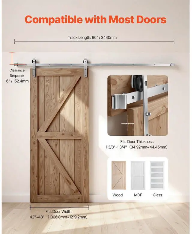 • Fit Most Doors: Our sliding door hardware kit is compatible with doors that are 1-3/8 to 1-3/4 inches thick (34.92 mm ~ 44.45 mm), and 42 to 48 inches wide. Ideal for wood, glass, and MDF barn doors.