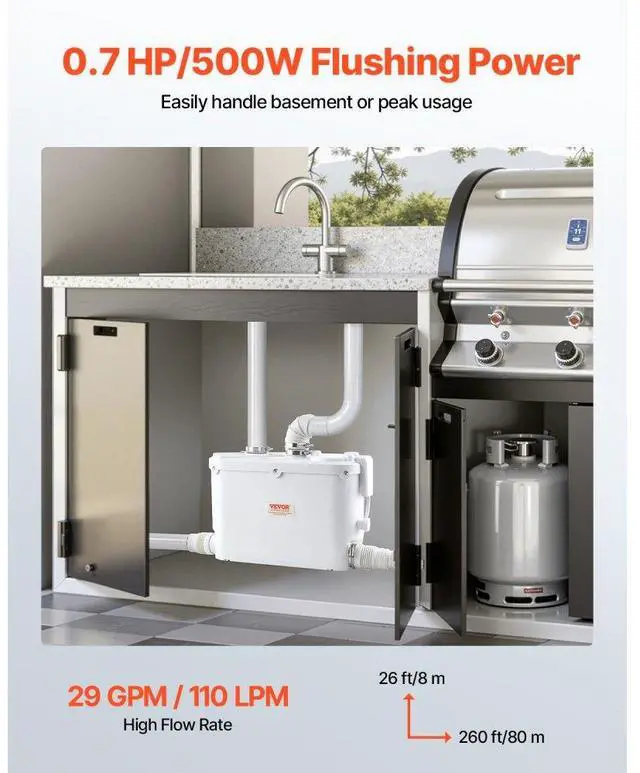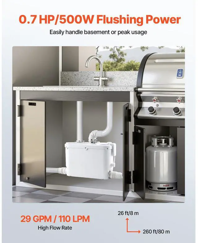 Macerator Pump 500W 29 GPM Flow 26 ft Head Lift Pump for Kitchen Basement Sink