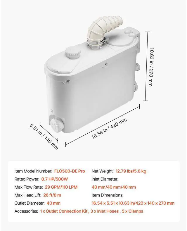 Max Head Lift: 26 ft/8 m,Inlet Diameter: 89 mm/40 mm/40 mm/40 mm,Outlet Diameter: 40 mm,Item Model Number: FLO500-DE Pro,Rated Power: 0.7 HP/500W,Item Dimensions: 16.54 x 5.51 x 10.63 in/420 x 140 x 270 mm,Max Flow Rate: 29 GPM/110 LPM,Net Weight: 12.79 lbs/5.8 kg