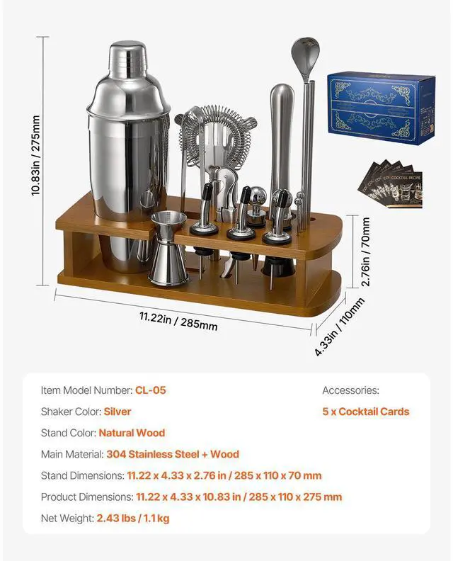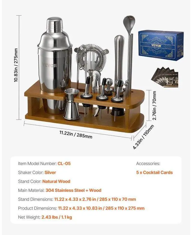 Stand Color: Natural Wood,Shaker Color: Silver,Item Model Number: CL-05,Stand Dimensions: 11.22 x 4.33 x 2.76 in / 285 x 110 x 70 mm,Product Dimensions: 11.22 x 4.33 x 10.83 in / 285 x 110 x 275 mm,Net Weight: 2.43 lbs / 1.1 kg,Main Material: 304 Stainless Steel + Wood