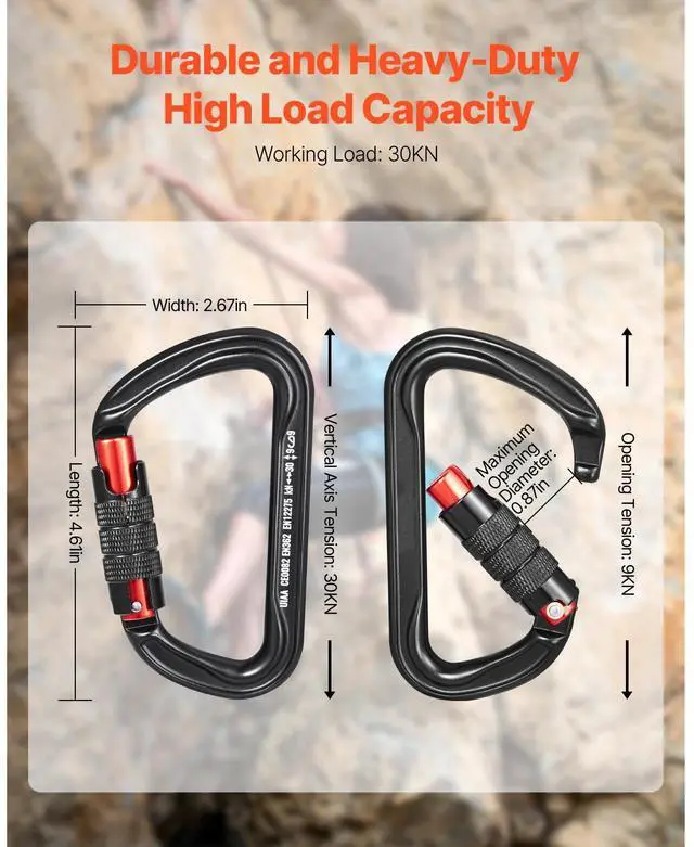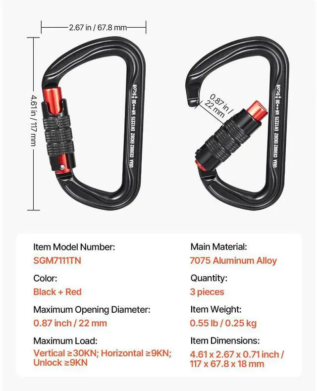 Maximum Load: Vertical 30KN; Horizontal 9KN; Unlock 9KN,Color: Black + Red,Item Model Number: SGM7111TN,Quantity: 3 pieces,Item Dimensions: 4.61 x 2.67 x 0.71 inch / 117 x 67.8 x 18 mm,Maximum Opening Diameter: 0.87 inch / 22 mm,Main Material: 7075 Aluminum Alloy,Item Weight: 0.55 lb / 0.25 kg