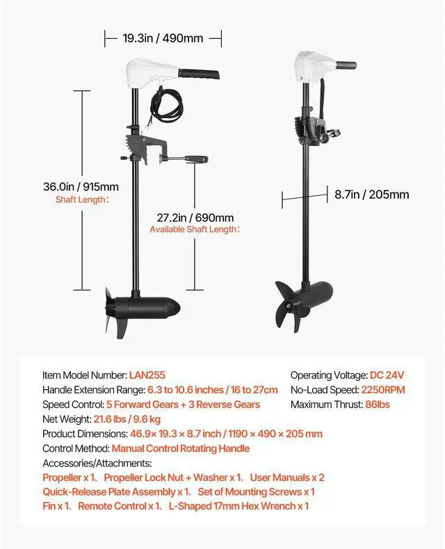 Handle Extension Range: 6.3 to 10.6 inches / 16 to 27cm,Operating Voltage: DC 24V,Control Method: Manual Control Rotating Handle,Item Model Number: LAN255,No-Load Speed: 2250RPM,Speed Control: 5 Forward Gears + 3 Reverse Gears,Product Dimensions: 46.9 x 19.3 x 8.7 inch/1190 x 490 x 205 mm,Net Weight: 21.6 lbs / 9.6 kg,Maximum Thrust: 86lbs