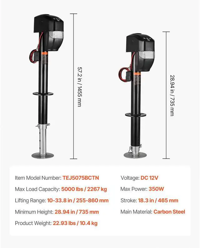 Max Power: 350W,Stroke: 18.3 in / 465 mm,Voltage: DC 12V,Item Model Number: TEJ5075BCTN,Product Weight: 22.93 lbs / 10.4 kg,Max Load Capacity: 5000 lbs / 2267 kg,Lifting Range: 10-33.8 in/255-860 mm,Main Material: Carbon Steel,Minimum Height: 28.94 in / 735 mm