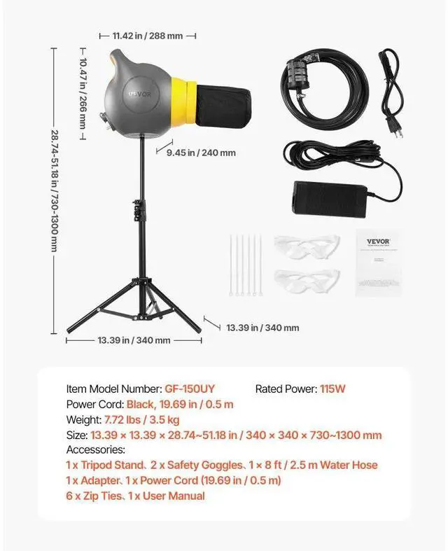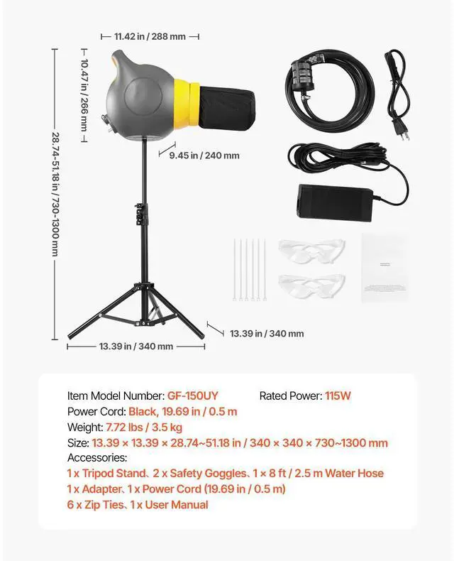 Power Cord: Black, 208.66 in / 5.3 m,Size: 16.14 x 14.17 x 28.54~52.36 in / 410 x 360 x 725~1330 mm,Item Model Number: GF-150UY,Rated Power: 120W,Weight: 5.84 lbs / 2.65 kg