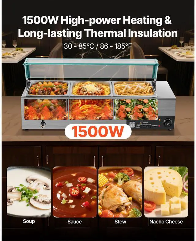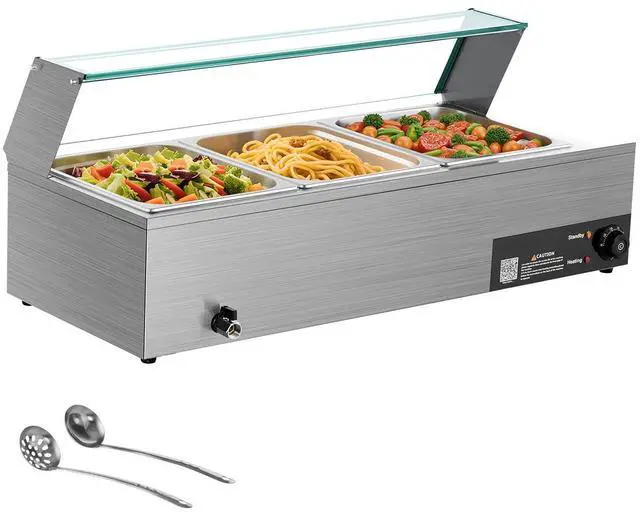 • VEVOR Commercial Electric Food Warmer Countertop Buffet 3*8Qt with Glass Shield