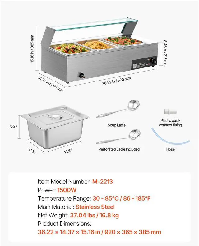 Capacity: 3 x 8QT,Item Model Number: SC-TC-213,Product Weight: 16 kg / 35.3 lbs,Temperature Range: 86-185°F / 30-85°C,Power: 1500W,Main Material: Stainless Steel,Product Size: 930 x 406 x 382 mm / 36.6 x 16 x 15 in