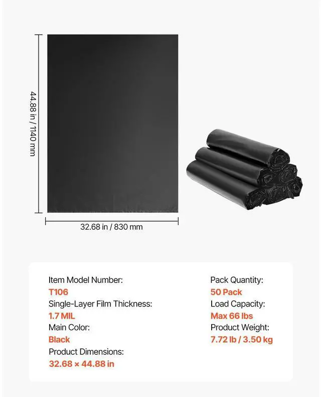 Main Color: Black,Load Capacity: 66 lbs,Pack Quantity: 50 Pack,Single-Layer Film Thickness: 1.7 MIL,Item Model Number: T106,Product Weight: 7.72 lb / 3.50 kg,Product Dimensions: 32.68 x 44.88 in / 830 x 1140 mm