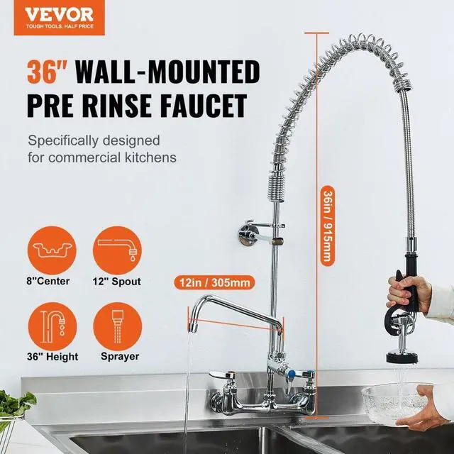 VEVOR Commercial Faucet with Pre-Rinse Sprayer, 36" Height, 8" Center, 12" Swing Spout, Wall Mount Kitchen Sink Faucet, Brass Constructed Device with Pull Down Spray, for 1/2/3 Compartment Sink