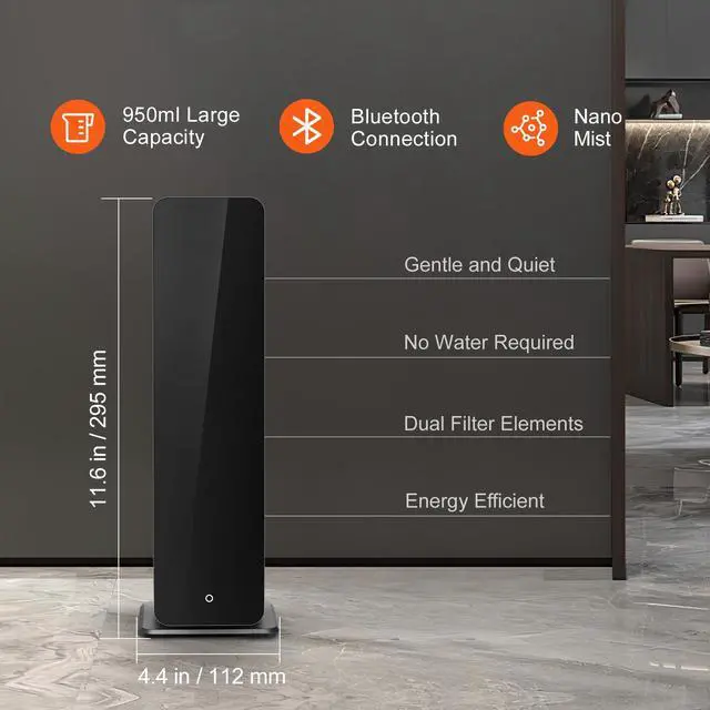 Noise Level: 57db,Capacity: 945 ± 5ml,Item Model Number: A316,Rated Power: 6W,Atomization Rate: 0.192.07 g/h,Coverage Area: 3000ft²,Shell Material: Stainless Steel + Glass,Product Dimensions: 7.7 x 5.9 x 23.0 in / 195 x 150 x 585 mm,Net Weight: 7.9 lbs / 3.6 kg