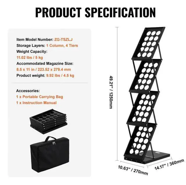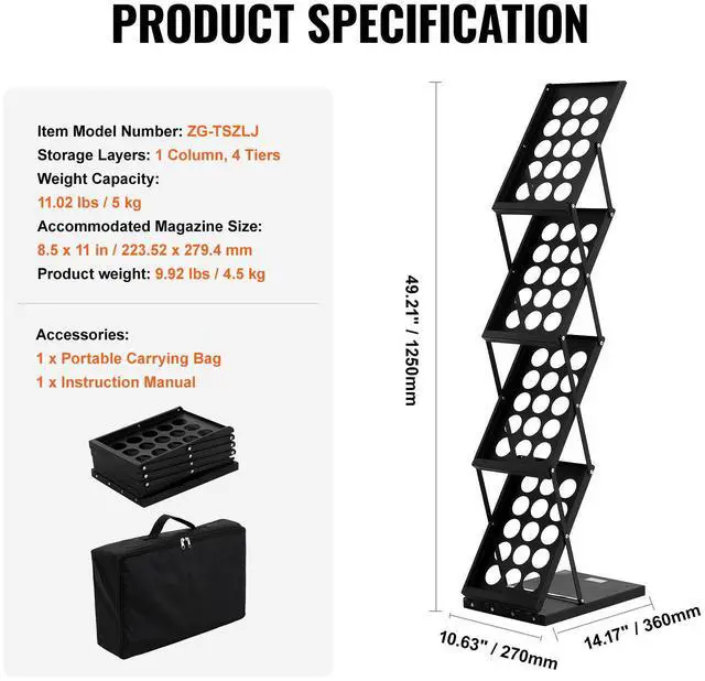 Weight Capacity: 11.02 lbs / 5 kg,Storage Layers: 1 Column, 4 Tiers,Item Model Number: ZG-TSZLJ,Product Weight: 9.92 lbs / 4.5 kg,Accommodated Size: 8.5 x 11 in / 223.52 x 279.4 mm,Product Dimensions: 10.63 x 14.17 X 49.21 in / 270 x 360 x 1250 mm