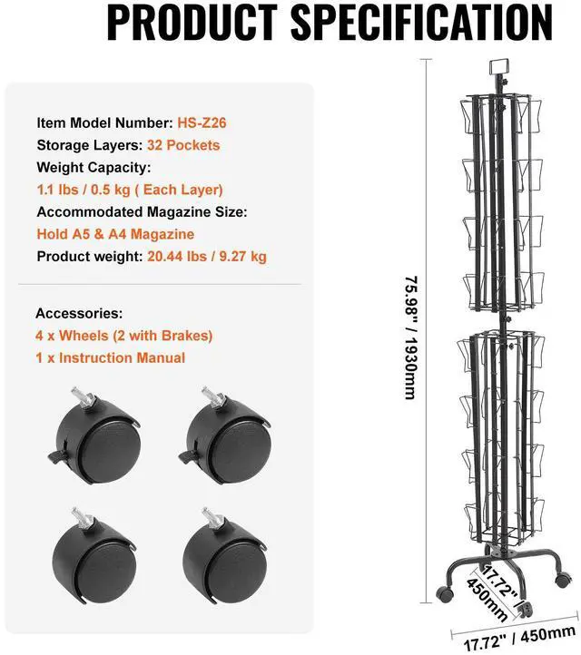 Storage Pockets: 32 Pockets,Weight Capacity: 1.1 lbs / 0.5 kg ( Each Layer),Item Model Number: HS-Z26,Product Weight: 20.44 lbs / 9.27 kg,Product Dimensions: 17.72 x 17.72 x 75.98 in / 450 x 450 x 1930 mm