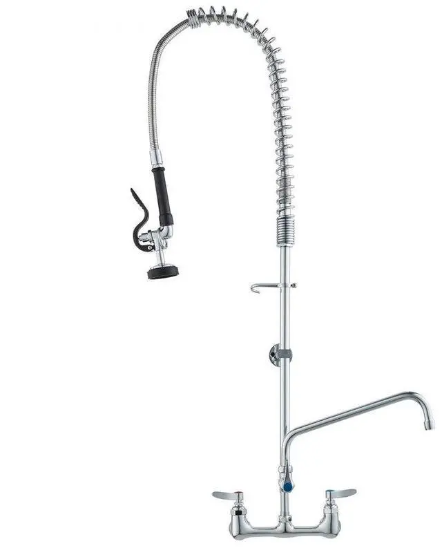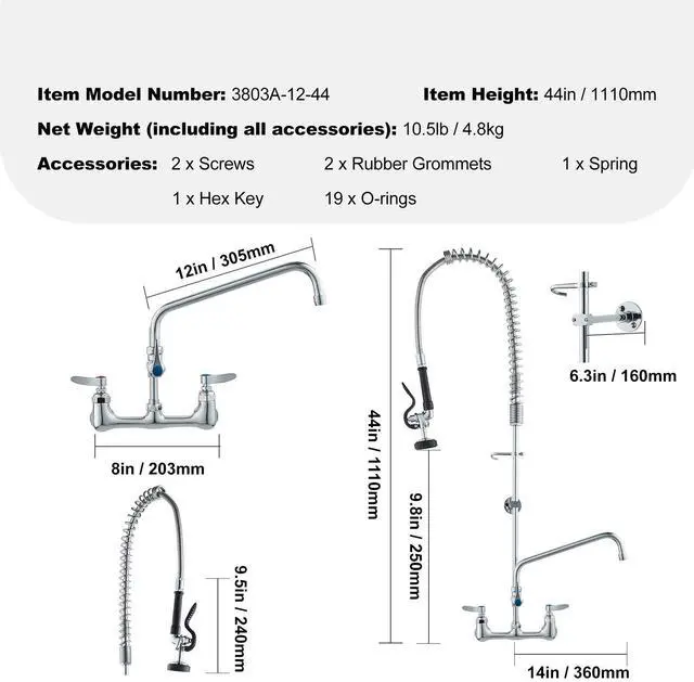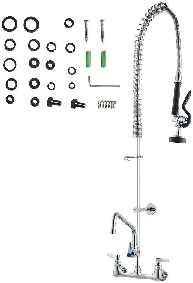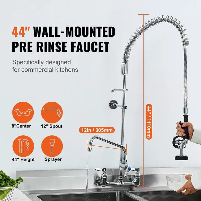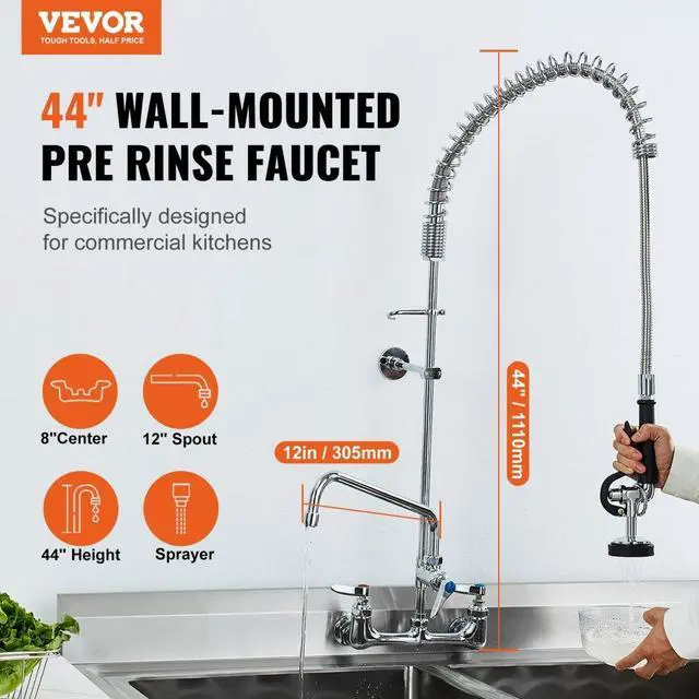 VEVOR Commercial Faucet with Pre-Rinse Sprayer, 44" Height, 8" Center, 12" Swing Spout, Wall Mount Kitchen Sink Faucet, Brass Constructed Device with Pull Down Spray, for 1/2/3 Compartment Sink