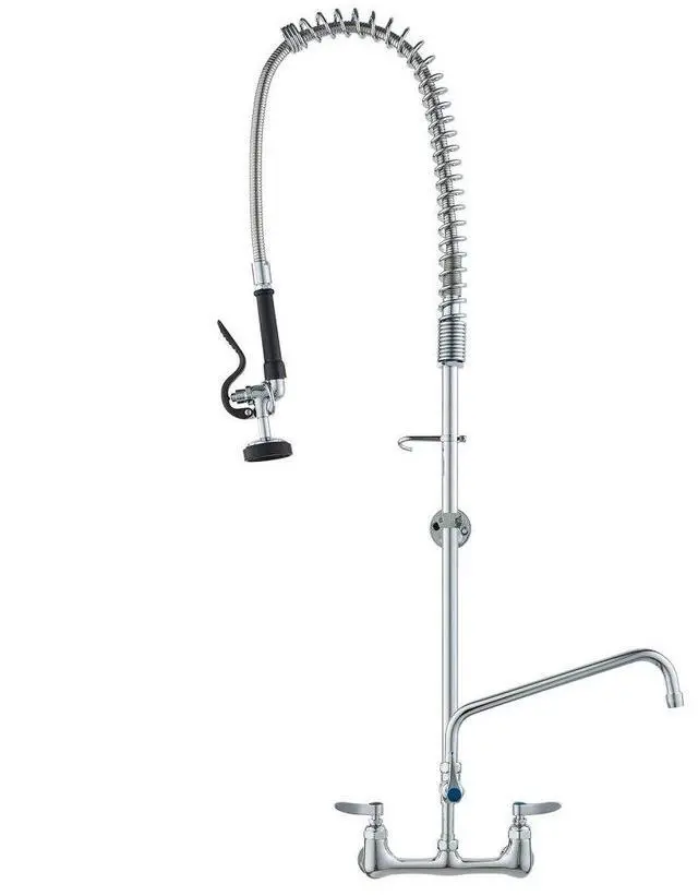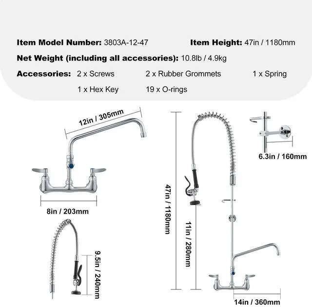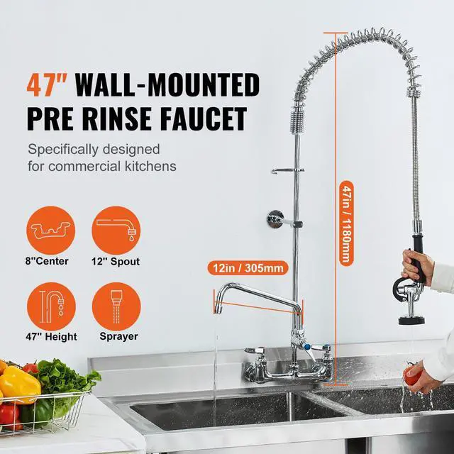 VEVOR Commercial Faucet with Pre-Rinse Sprayer, 47" Height, 8" Center, 12" Swing Spout, Wall Mount Kitchen Sink Faucet, Brass Constructed Device with Pull Down Spray, for 1/2/3 Compartment Sink