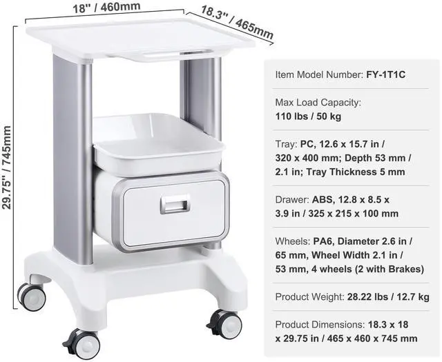 Tray: PC, 12.8 x 8.5 x 3.9 in/320 x 400 mm; Depth 35 mm / 2.1 in; Thickness 5 mm,Wheels: PA6, Diameter 65 mm / 2.6 in, Wheel Width 2.1 in / 53 mm, 4 Wheels (2 with Brakes),Item Model Number: Y-1T1C,Product Weight: 28.22 lbs / 12.7 kg,Max Load Capacity: 110 lbs / 50 kg,Drawer: ABS, 340 x 295 x 100 mm / 13.4 x 11.6 x 3.9 in,Product Dimensions: 18.3 x 18 x 29.75 in / 465 x 465 x 745 mm