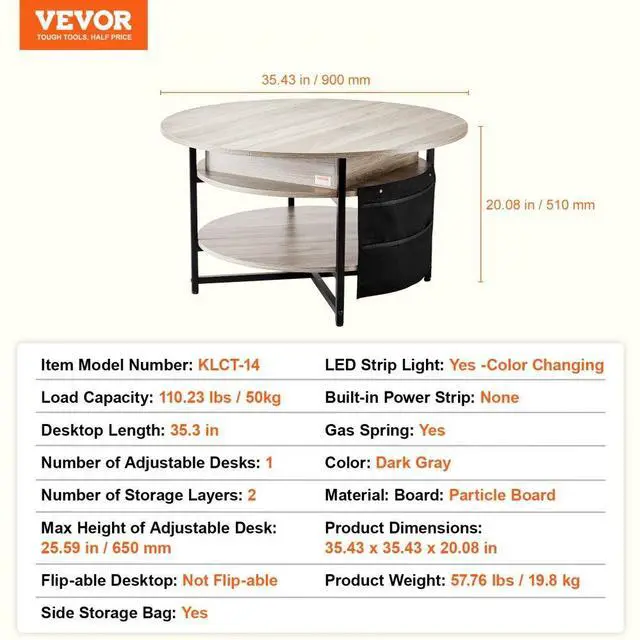 Number of Adjustable Desks: 1,Flip-able Desktop: Not Flip-able,Color: Dark Gray,Gas Spring: Yes,Side Storage Bag: Yes,Material: Board: Particle Board,Built-in Power Strip: None,Product Dimensions: 35.43 x 35.43 x 20.08 in / 900 x 900 x 510 mm,Ambient Light: None,Number of Storage Layers: 2,Load Capacity: 110.23 lbs / 50 kg,Item Model Number: KLCT-14,Product Weight: 57.76lbs / 19.8 kg,Desktop Length: 35.3 in,Max Height of Adjustable Desk: 25.59 in/650 mm