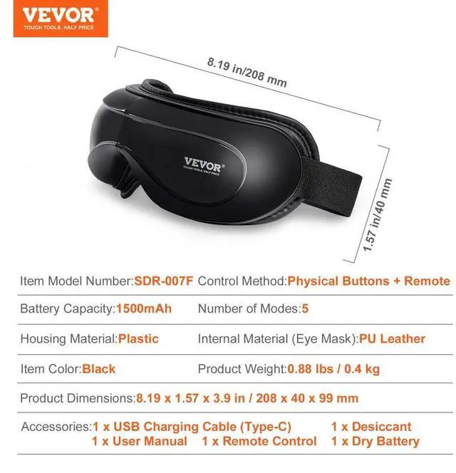 Battery Capacity: 1500mAh,Housing Material: Plastic,Item Color: Black,Control Method: Physical Buttons + Remote,Number of Modes: 5,Item Model Number: SDR-007F,Product Weight: 0.88 lbs / 0.40 kg,Product Dimensions: 8.19 x 1.57 x 3.9 in / 208 x 40 x 99 mm,Internal Material (Eye Mask): PU Leather