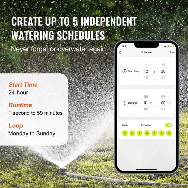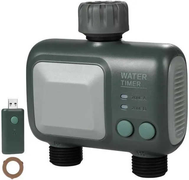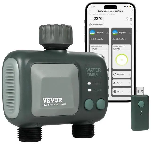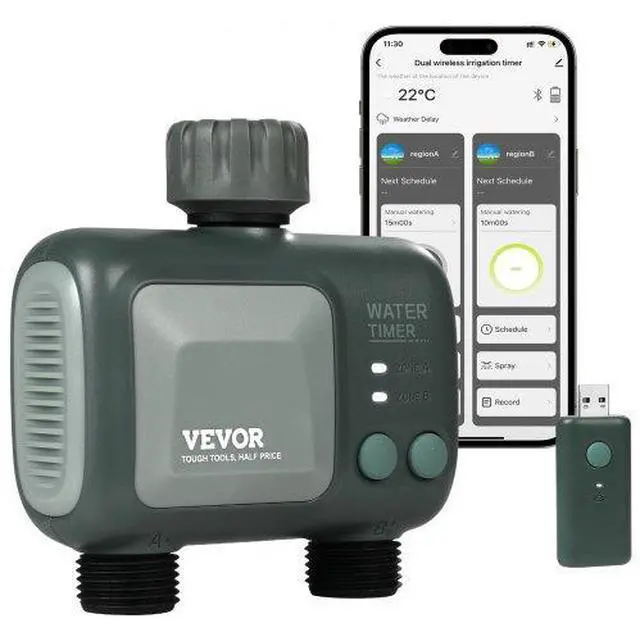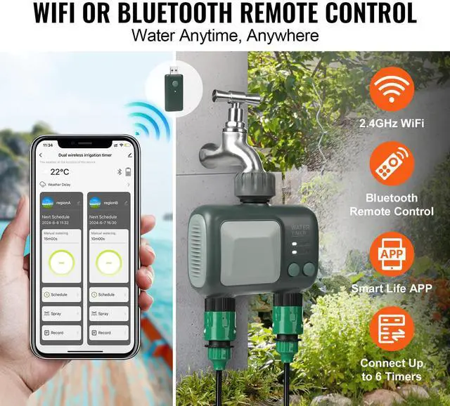 • VEVOR WiFi Sprinkler Timer, 2 Outlets, Smart Hose Faucet Water Timer with Brass Inlet, APP Control via 2.4Ghz WiFi or Bluetooth, Voice Control with Alexa and Google Assistant, IPX6 for Yard Watering
