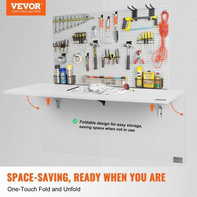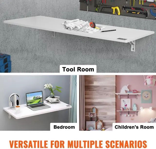 VEVOR Wall Mounted Folding Table, 43.31" x 18.11" Wall Mount Drop Leaf Table, Floating Desk with Iron Bracket, Fold Down Desk for Small Spaces, Home Office, Dining, Laundry Room, Kitchen, Bar, White