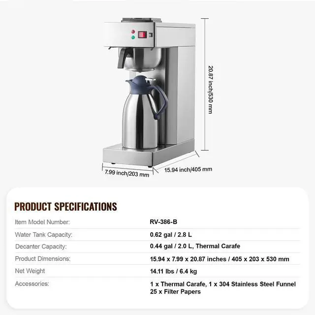 Water Tank Capacity: 0.62 gal / 2.8 L,Item Model Number: RV-386-B,Carafe Capacity: 0.44 gal / 2.0 L, Thermal Carafe,Product Dimensions: 15.94 x 7.99 x 20.87 inches / 405 x 203 x 530 mm,Net Weight: 14.11 lbs / 6.4 kg