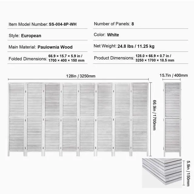 Number of Panels: 8,Color: White,Item Model Number: SS-004-8P-WH,Style: European,Folded Dimensions: 66.9 x 15.7 x 5.9 in / 1700 x 400 x 150 mm,Product Dimensions: 128.0 x 66.9 x 0.7 in / 3250 x 1700 x 18.5 mm,Net Weight: 24.8 lbs / 11.25 kg,Main Material: Paulownia Wood
