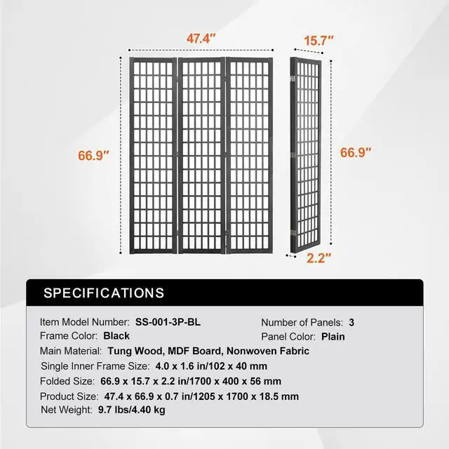 Frame Color: Black,Number of Panels: 3,Item Model Number: SS-001-3P-BL,Folded Size: 66.9 x 15.7 x 2.2 in / 1700 x 400 x 56 mm,Panel Color: Plain,Single Inner Frame Size: 4.0 x 1.6 in / 102 x 40 mm,Net Weight: 9.7 lbs / 4.40 kg,Main Material: Tung Wood, MDF Board, Nonwoven Fabric,Product Size: 47.4 x 66.9 x 0.7 in / 1205 x 1700 x 18.5 mm