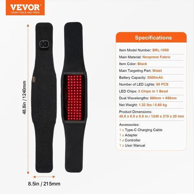 Main Targeting Part: Waist,Dual Wavelengths: 660nm + 850nm,Battery Capacity: 3000mAh,Item Color: Black,LED Chips: 3 Chips in 1 Bead,Item Model Number: BRL-1000,Product Dimensions: 48.8 x 8.5 x 0.8in / 1240 x 215 x 20 mm,Net Weight: 1.32 lbs / 0.60 kg,Main Material: Neoprene Fabric,Number of LED Lights: 80 PCS