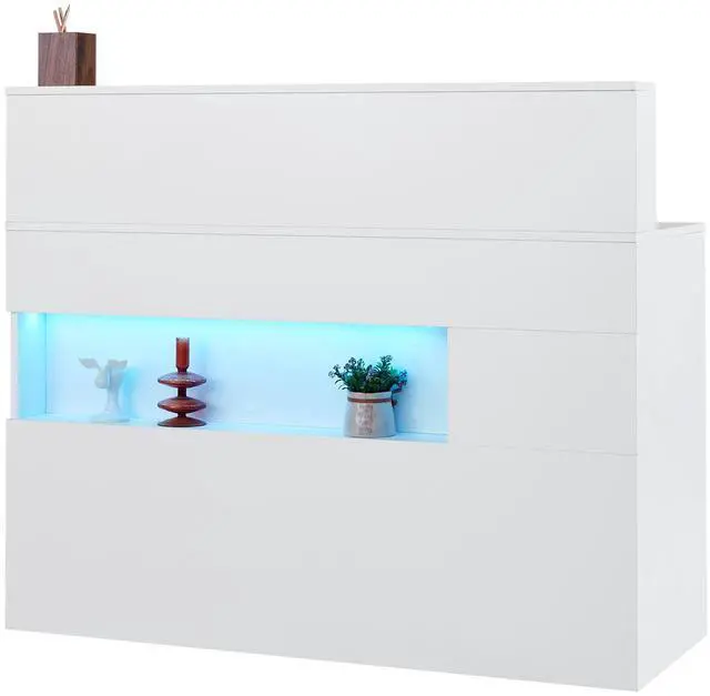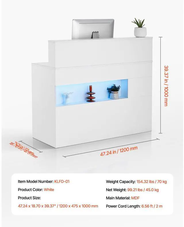 Shape: Rectangular,Lower Left Cabinet: 11.81 x 20.08 x 17.72 in / 300 x 510 x 450 mm,Color: White,Drawer: 11.18 x 2.83 x 9.61 in / 284 x 72 x 244 mm,LED Lights: Included (no remote control),Keyboard Tray: 20.94 x 11.81 x 4.53 in / 532 x 300 x 115 mm,Product Size: 47.24 x 18.70 x 39.37 in / 1200 x 475 x 1000 mm,Power Cord Length: 6.56 ft / 2 m,Weight Capacity: 154.32 lbs / 70 kg,Front Storage Space: 33.58 x 4.72 x 7.87 in / 853 x 120 x 200 mm,Item Model Number: KLFD-01,Net Weight: 99.21 lbs / 45.0 kg,Main Material: MDF