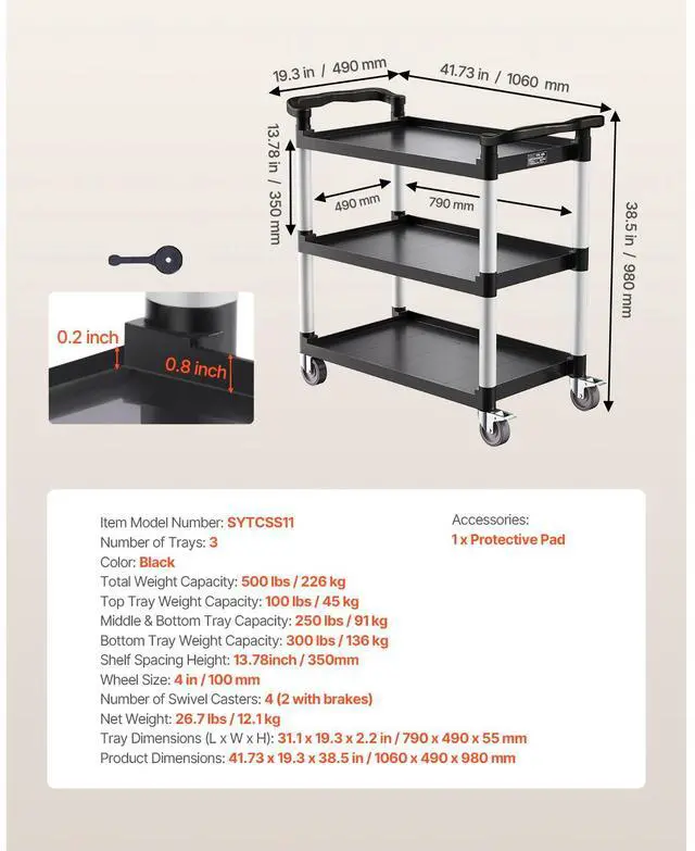 Wheel Size: 4 in / 100 mm,Number of Swivel Casters: 4 (2 with brakes),Top Tray Weight Capacity: 100 lbs / 45 kg,Tray Dimensions (L x W x H): 31.1 x 19.3 x 2.2 in / 790 x 490 x 55 mm,Number of Trays: 3,Color: Black,Bottom Tray Weight Capacity: 300 lbs / 136 kg,Middle Tray Weight Capacity: 250 lbs / 91 kg,Product Dimensions: 41.73 x 19.3 x 38.5 in / 1060 x 490 x 980 mm,Shelf Spacing Height: 13.8 in / 350 mm,Total Weight Capacity: 500 lbs / 226 kg,Item Model Number: SYTCSS11,Net Weight: 26.7 lbs / 12.1 kg