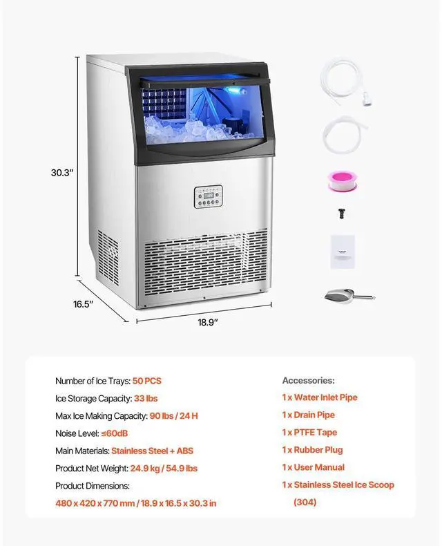 Noise Level: 60dB,Number of Ice Trays: 50 PCS,Max Ice Making Capacity: 90 lbs / 24 H,Main Materials: Stainless Steel + ABS,Item Model Number: CIM-500T,Product Net Weight: 24.9 kg / 54.9 lbs,Ice Storage Capacity: 33 lbs,Product Dimensions: 480 x 420 x 770 mm / 18.9 x 16.5 x 30.3 in