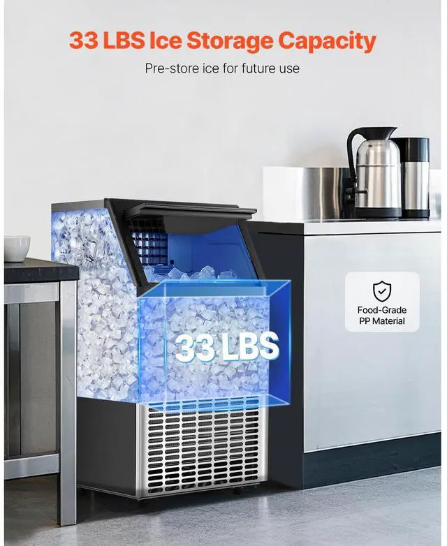 Noise Level: 60dB,Number of Ice Trays: 45 PCS,Max Ice Making Capacity: 100 lbs / 24 H,Main Materials: Stainless Steel + Cold Rolled Steel Sheet + PS,Item Model Number: HZB-45,Product Net Weight: 26.5 kg / 58.4 lbs,Ice Storage Capacity: 33 lbs,Product Dimensions: 448 x 400 x 798mm / 17.6 x 15.7 x 31.4 in (with feet)