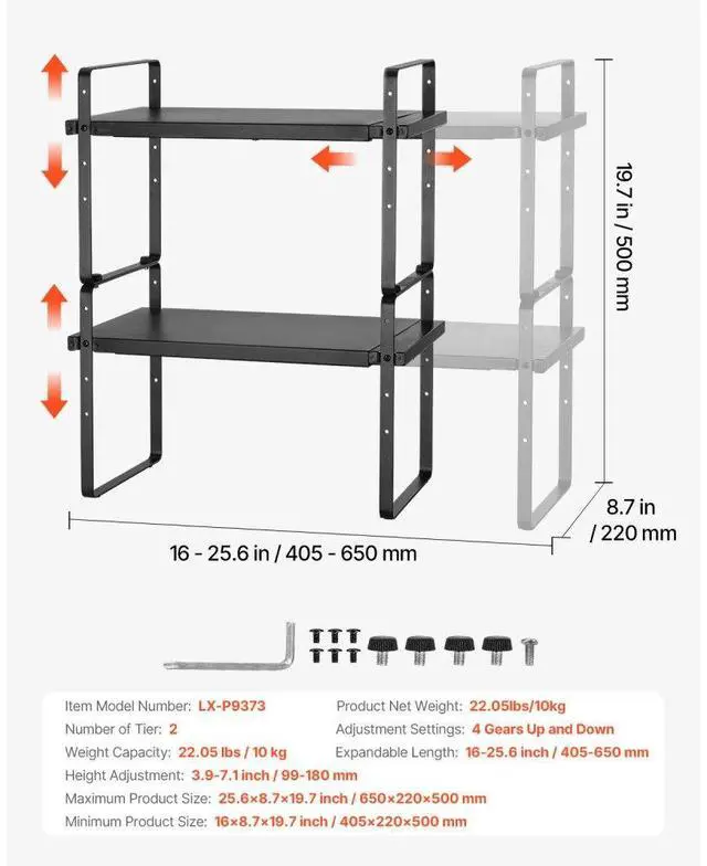 Height Adjustment: 3.9-7.1 inch / 99-180 mm,Weight Capacity: 22.05 lbs / 10 kg,Expandable Length: 16-25.6 inch / 405-650 mm,Item Model Number: LX-P9373,Product Net Weight: 7.3 lbs / 3.31 kg,Maximum Product Size: 25.6x8.7x19.7 inch / 650x220x500 mm,Number of Tier: 2,Minimum Product Size: 16x8.7x19.7 inch / 405x220x500 mm