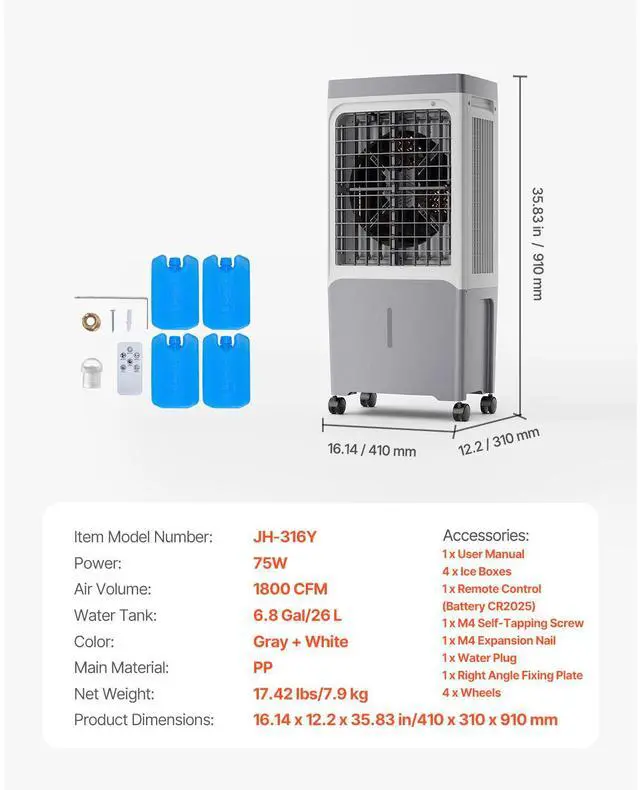 Noise Level: 60dB,Air Volume: 1800 CFM,Water Tank: 6.8 Gal/26 L,Color: Gray + White,Item Model Number: JH-316Y,Product Dimensions: 16.14 x 12.2 x 35.83 in/410 x 310 x 910 mm,Net Weight: 17.42 lbs/7.9 kg,Power: 75W,Main Material: PP