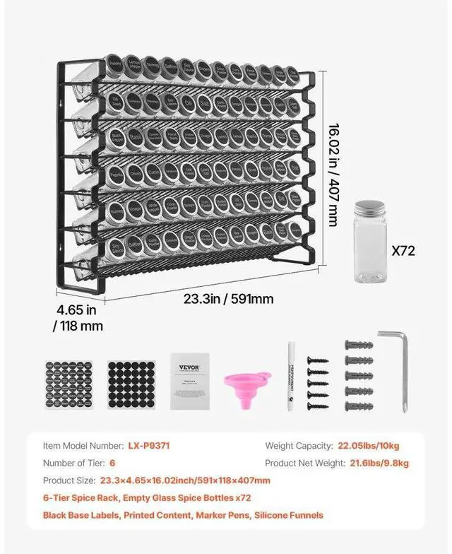 Weight Capacity: 22.05 lbs / 10 kg,Item Model Number: LX-P9371,Product Net Weight: 21.6 lbs / 9.8 kg,Number of Tier: 6,Product Size: 23.3x4.65x16.02 inch / 591x118x407 mm