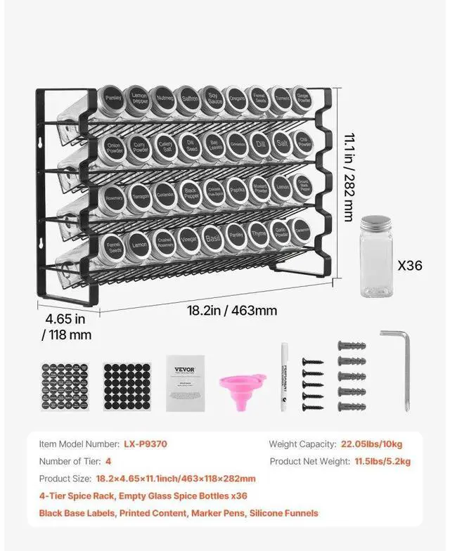 Weight Capacity: 22.05 lbs / 10 kg,Item Model Number: LX-P9370,Product Net Weight: 11.5 lbs / 5.2 kg,Number of Tier: 4,Product Size: 18.2x4.65x11.1 inch / 463x118x282 mm