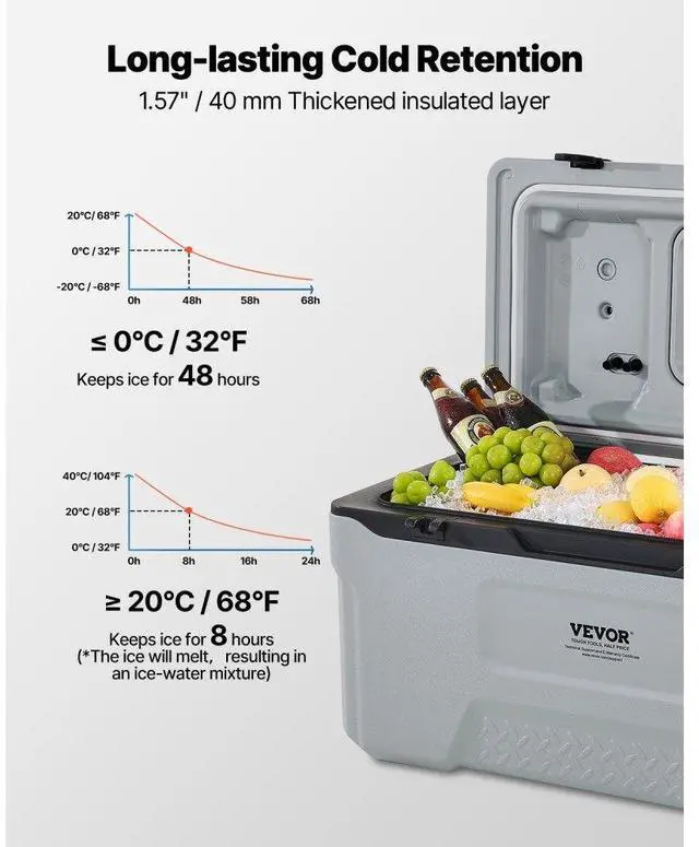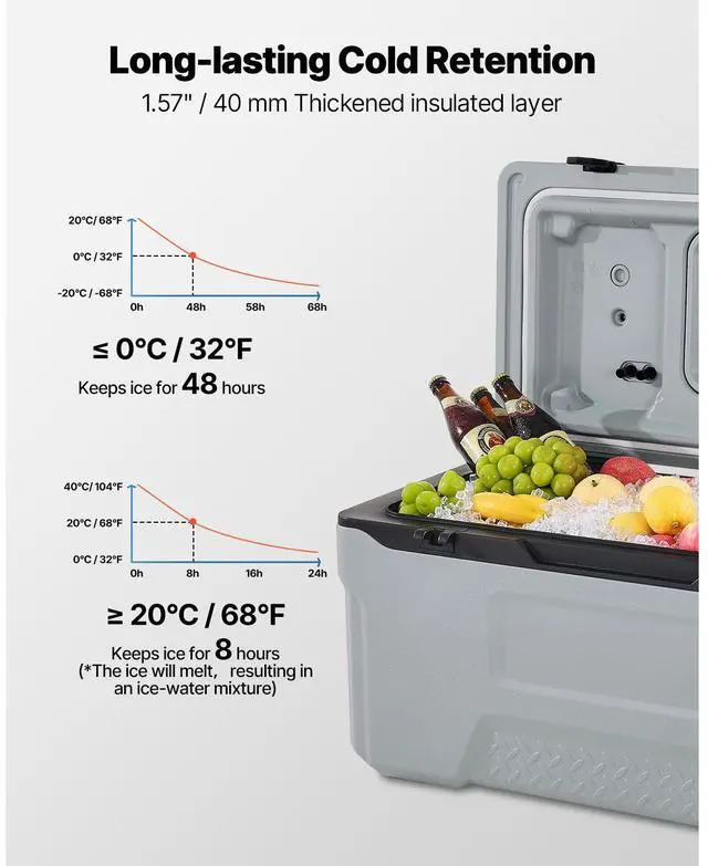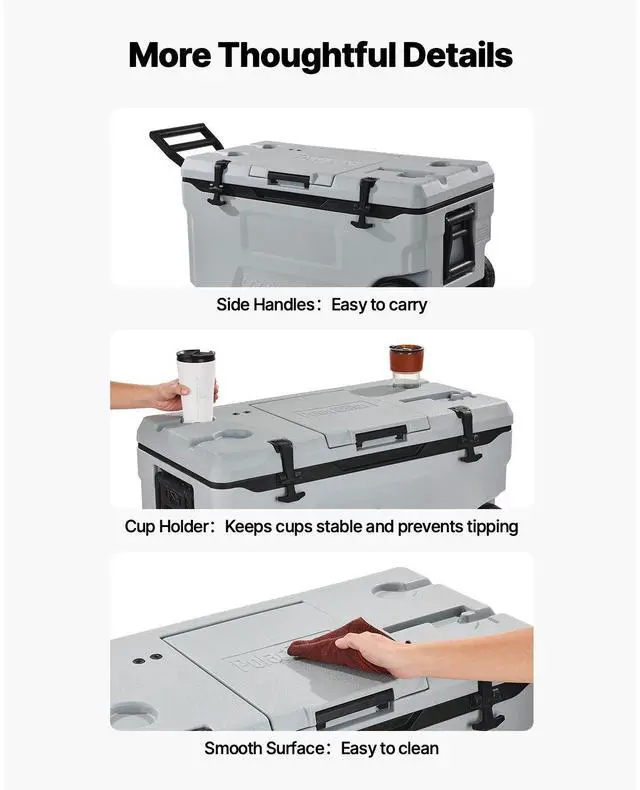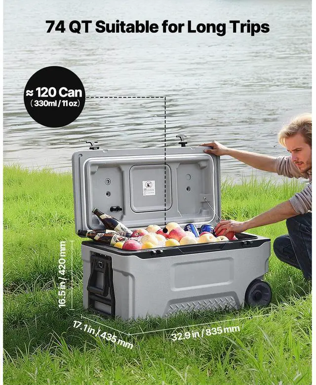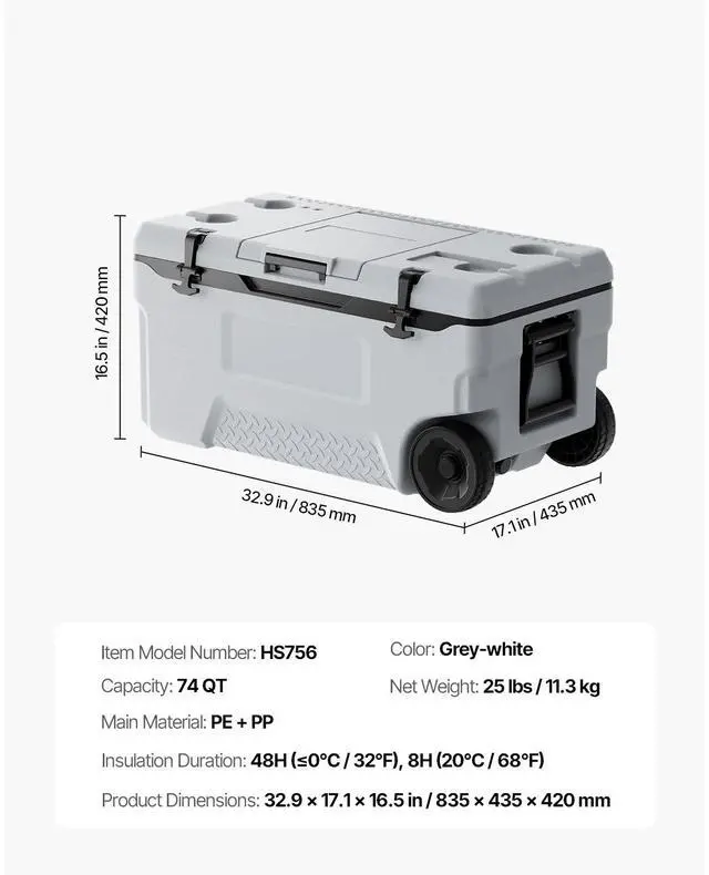 Capacity: 74 QT,Color: Grey-white,Item Model Number: HS915,Insulation Duration: 48H (0°C / 32°F), 8H (20°C / 68°F),Product Dimensions: 32.9 x 17.1 x 16.5 in / 835 x 435 x 420 mm,Net Weight: 25 lbs / 11.3 kg,Main Material: PE + PP