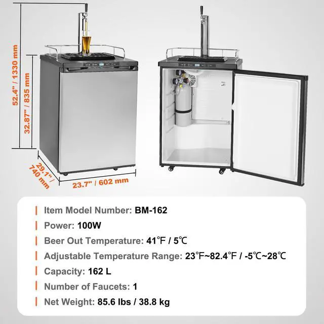 Capacity: 162 L,Number of Faucets: 1,Item Model Number: BM-162,Adjustable Temperature Range: 23~82.4 / -5~28,Net Weight: 85.6 lbs / 38.8 kg,Power: 100W,Beer Out Temperature: 41 / 5,Product Size: 23.7 x 29.1 x 52.4 inch / 602 x 740 x 1330 mm