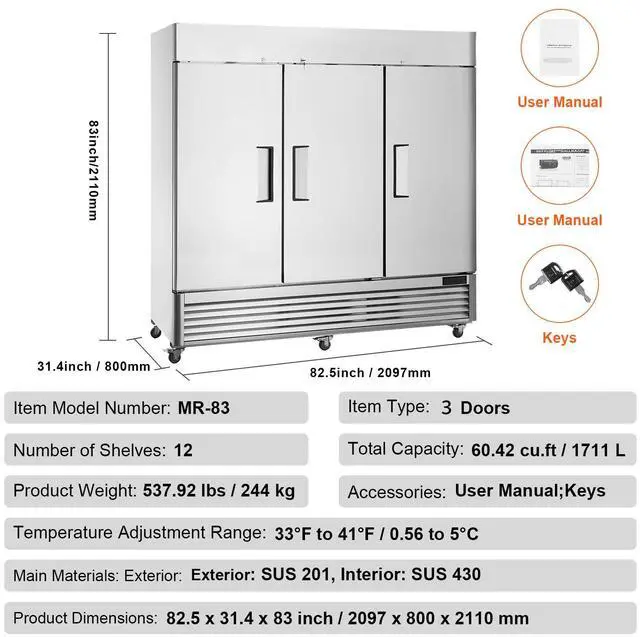 Number of Shelves: 12,Temperature Adjustment Range: 33 to 41 / 0.56 to 5 °C,Main Materials: Exterior: SUS 201, Interior: SUS 430,Total Capacity: 60.42 Cu.ft / 1711,Item Model Number: MR-83,Product Weight: 537.92 lbs / 244 kg,Item Type: 3 Doors,Product Dimensions: 82.5 x 31.4 x 83 inch / 2097 x 800 x 2110 mm