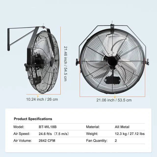 Noise Level: 60 dB,Air Speed: 25 ft/s (7.5 m/s),Waterproof Rating: IP44,Air Volume: 3450/3700/4150 CFM,Voltage: AC 120 V / 60 Hz,Model: BT-WL18B,Fan Blades Diameter: 18 inch / 45.7 cm,Quantity: 2,Material: All Metal,Speed Settings: 3,Power: 90 W