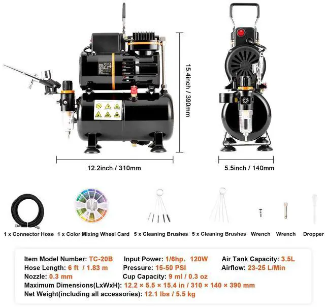 Airflow: 23-25 L/Min,Hose Length: 6 ft / 1.83 m,Nozzle: 0.3 mm,Input Power: 1/6hp120W,Item Model Number: TC-20B,Net Weight(including all accessories): 12.1 lbs / 5.5 kg,Maximum Dimensions(LxWxH): 12.2 x 5.5 x 15.4 in / 310 x 140 x 390 mm,Air Tank Capacity: 3.5L,Pressure: 15-50 PSI,Cup Capacity: 9 ml / 0.3 oz