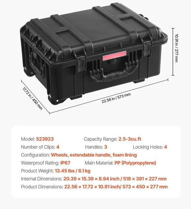 Number of Handles: 3,Number of Locking Holes: 4,Waterproof Rating: IP67,Configuration: Wheels, Telescoping Handle, Foam Liner,Capacity Range: 2.5-3 cu.ft,Item Model Number: 523923,Product Weight: 13.45 lbs / 6.1 kg,Number of Clips: 4,Product Dimensions: 22.56 x 17.72 x 10.91 inches / 573 x 450 x 277 mm,Internal Dimensions: 20.39 x 15.35 x 8.94 inches / 518 x 391 x 227 mm,Main Material: PP (Polypropylene)