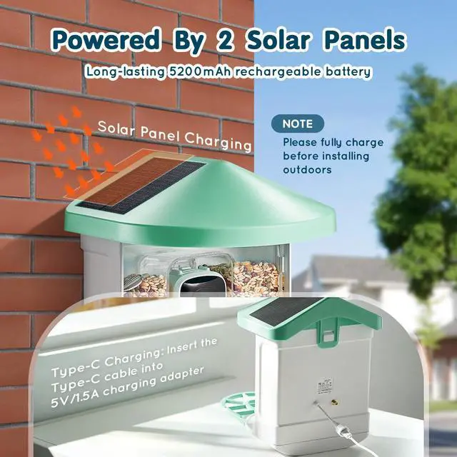 Number of Solar Panels: 2 (on the roof),Food Container Capacity: 2L,Battery Capacity: 5200mAh,Item Model Number: FB-A03,Product Weight: 3.7 lbs / 1.7 kg,Product Dimensions: 13.1 x 8.6 x 10.8 in / 335 x 220 x 275 mm (including stand),Camera Resolution: 2K (2304 * 1296)