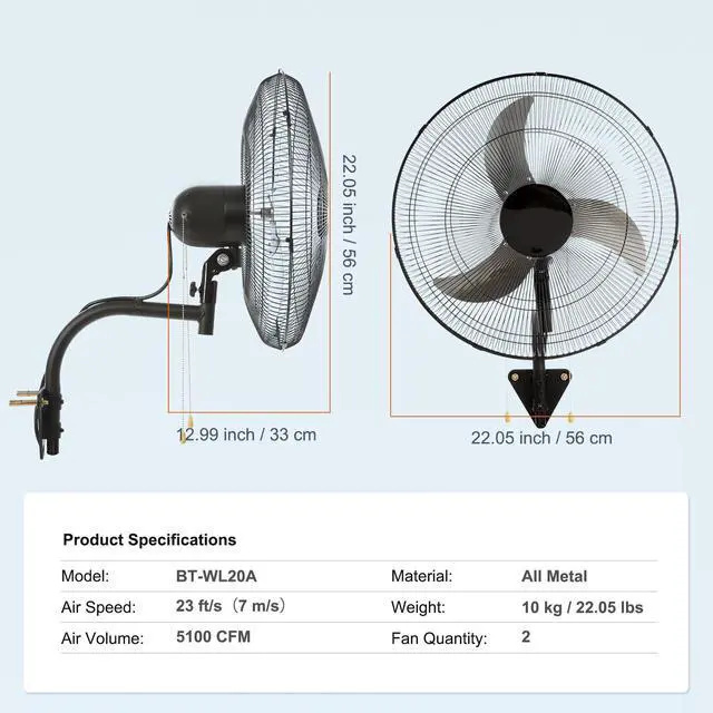 Noise Level: 60 dB,Speed: 1450 RPM,Air Speed: 23 ft/s (7 m/s),Air Volume: 3500/4000/4650 CFM,Voltage: AC 120 V / 60 Hz,Model: BT-WL20A,Fan Blades Diameter: 20 inch / 50.8 cm,Quantity: 2,Cover Area: 30 ft / 9 m,Material: All Metal,Speed Settings: 3,Power: 70 W