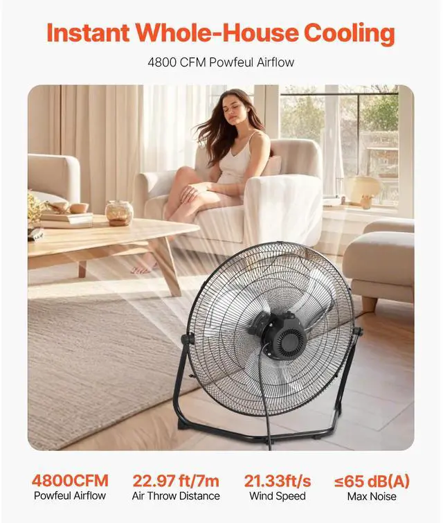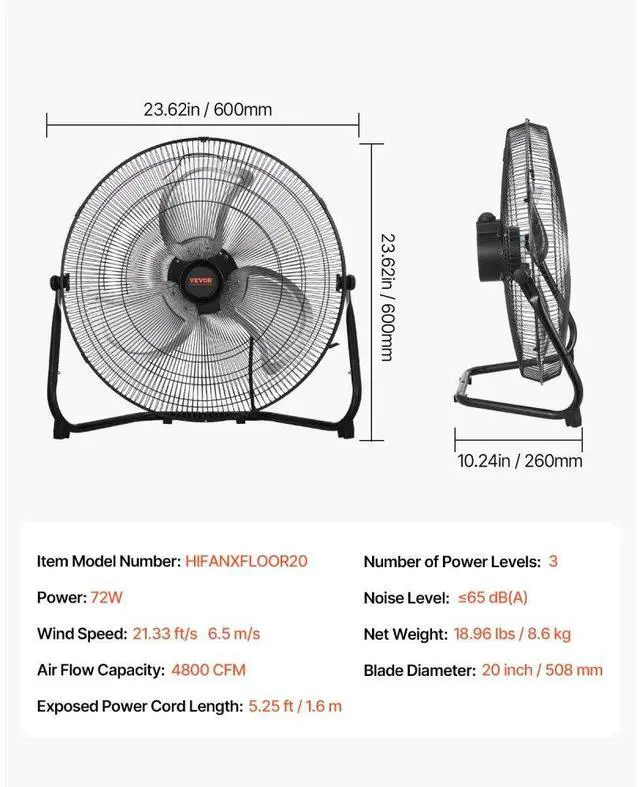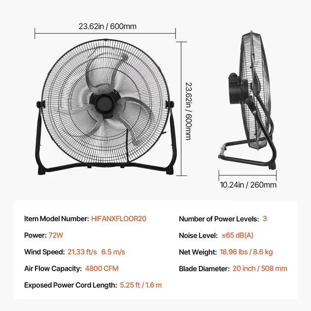 Noise Level: 65 dB(A),Blade Diameter: 20 inch / 508 mm,Number of Power Levels: 3,Air Flow Capacity: 4800 CFM,Wind Speed: 21.33 ft/s (6.5 m/s),Item Model Number: HIFANXFLOOR20,Exposed Power Cord Length: 5.25 ft / 1.6 m,Product Dimensions: 23.62 x 10.24 x 23.62 inch / 600 x 260 x 600 mm,Net Weight: 9.48 Ibs / 4.3 kg,Power: 72 W
